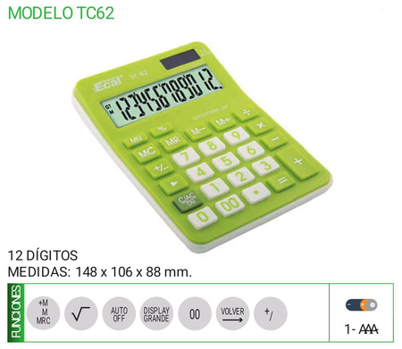 CALCULADORA ECAL TC62 MEDIANA 12 DG. + 1 PILA